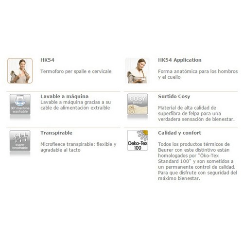 Cuello / hombros.Cierre de imán.Superficie suave, transpirable y agradable al tacto.Sistema calentamiento ultrarrápido. Control temperatura electrónico. Interruptor de 3 potencias.Potencia 100 w. Sistema cable extraíble.Apagado automático a los 90 min aprox. Lavable a máquina a 40º. Botón de presión, se ajusta a cada persona.Producto homologado por Oeko-Tex Standard 100. Está sometido a un permanente control de calidad.