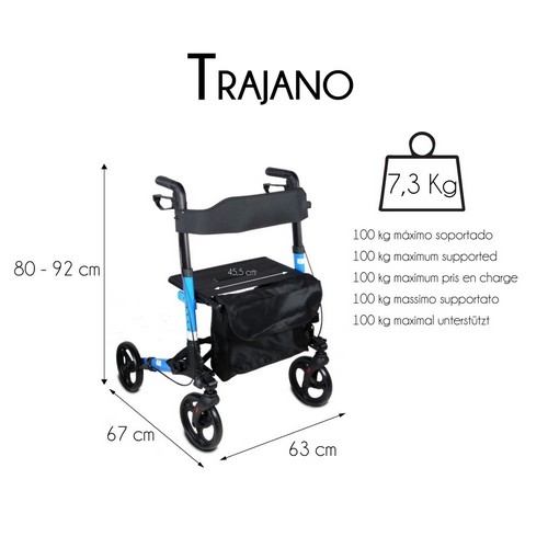 El diseño del andador para ancianos modelo Trajano es elegante y te permitirá acudir a cualquier sitio con él. Gracias a que está fabricado en aluminio con acabados azules, el andador es muy ligero, únicamente pesa 7,3 kg. Su altura es regulable de 80 a 92 cm y, gracias a esta característica, podrás adaptarlo a tus necesidades de una forma rápida y fácil.