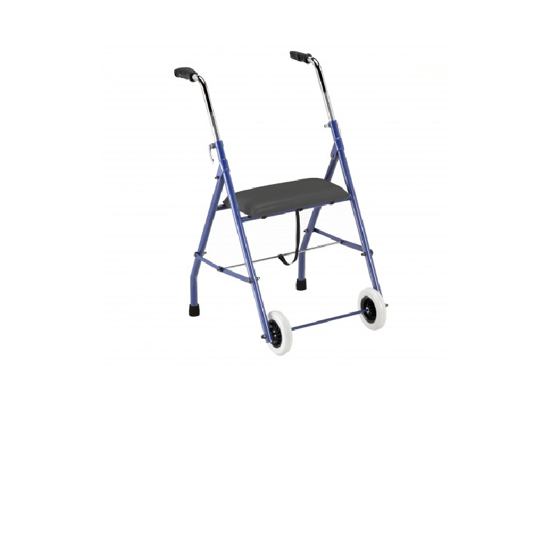 Andador de acero pintado en color azul, plegable, y con altura inferior de asiento para que personas más bajas puedan sentarse e incorporarse más fácilmente. Asiento desmontable.