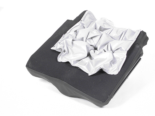 La base de aluminio del cojín es ajustable en altura, profundidad y ángulo e incorpora unas guías que permiten acoplar fácilmente los accesorios de posicionamiento. El cojín viene protegido por 2 fundas: funda interior resistente a la incontinencia que protege la base de la humedad y funda transpirable en contacto con el usuario.