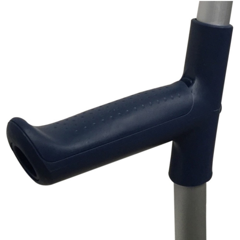 Bastón de aluminio con codera articulada. Regulable en la parte superior e inferior. Color azul y plata.