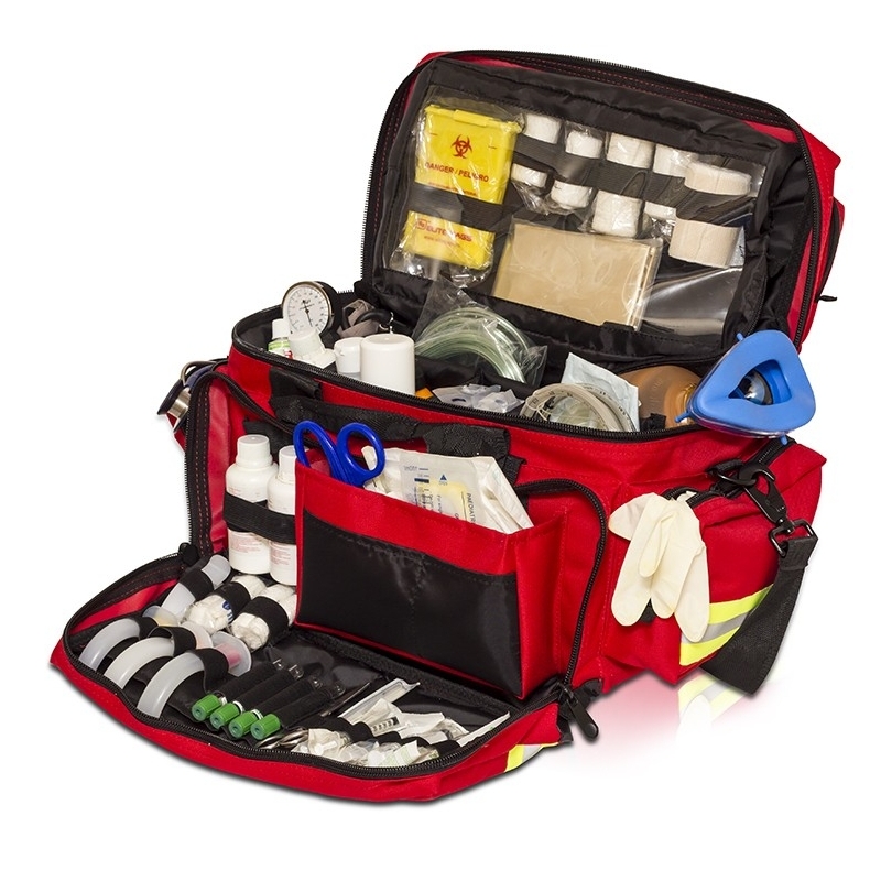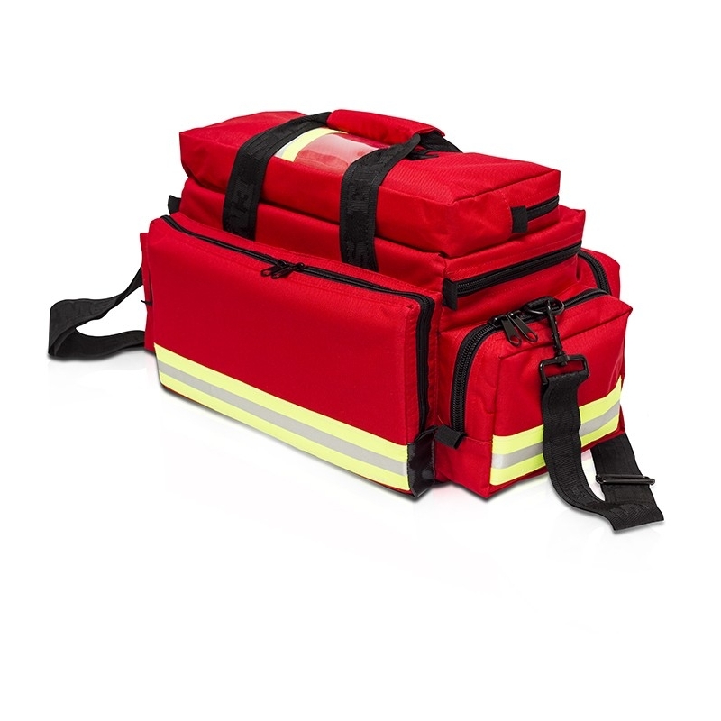 Bolsa de emergencias acolchada y de gran capacidad diseñada para alojar el material sanitario mas delicado, subdividida en su interior con 4 compartimentos de mediana capacidad y un compartimento alargado de gran capacidad.