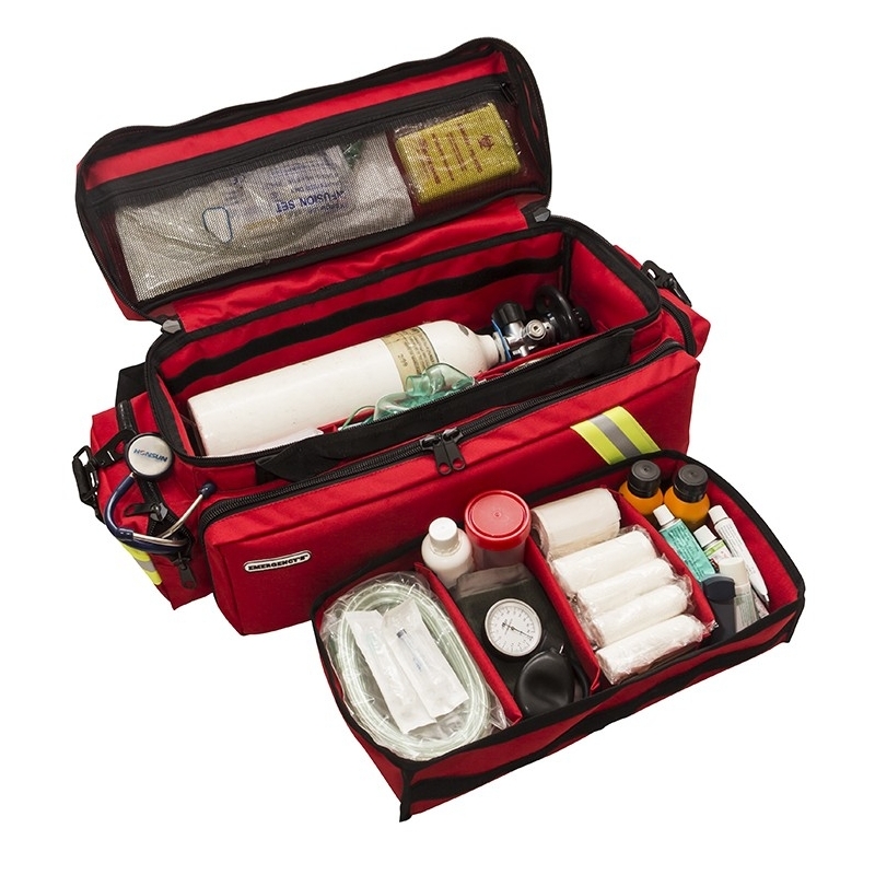 Bolsa de emergencias acolchada diseñada para alojar el material sanitario vinculado a la oxigenoterapia, subdividida en su interior a dos alturas: bandeja superior extraíble con divisores ajustables, parte inferior con tres separadores, diseñada para alojar la botella de oxígeno y bolsillo de rejilla en la solapa.