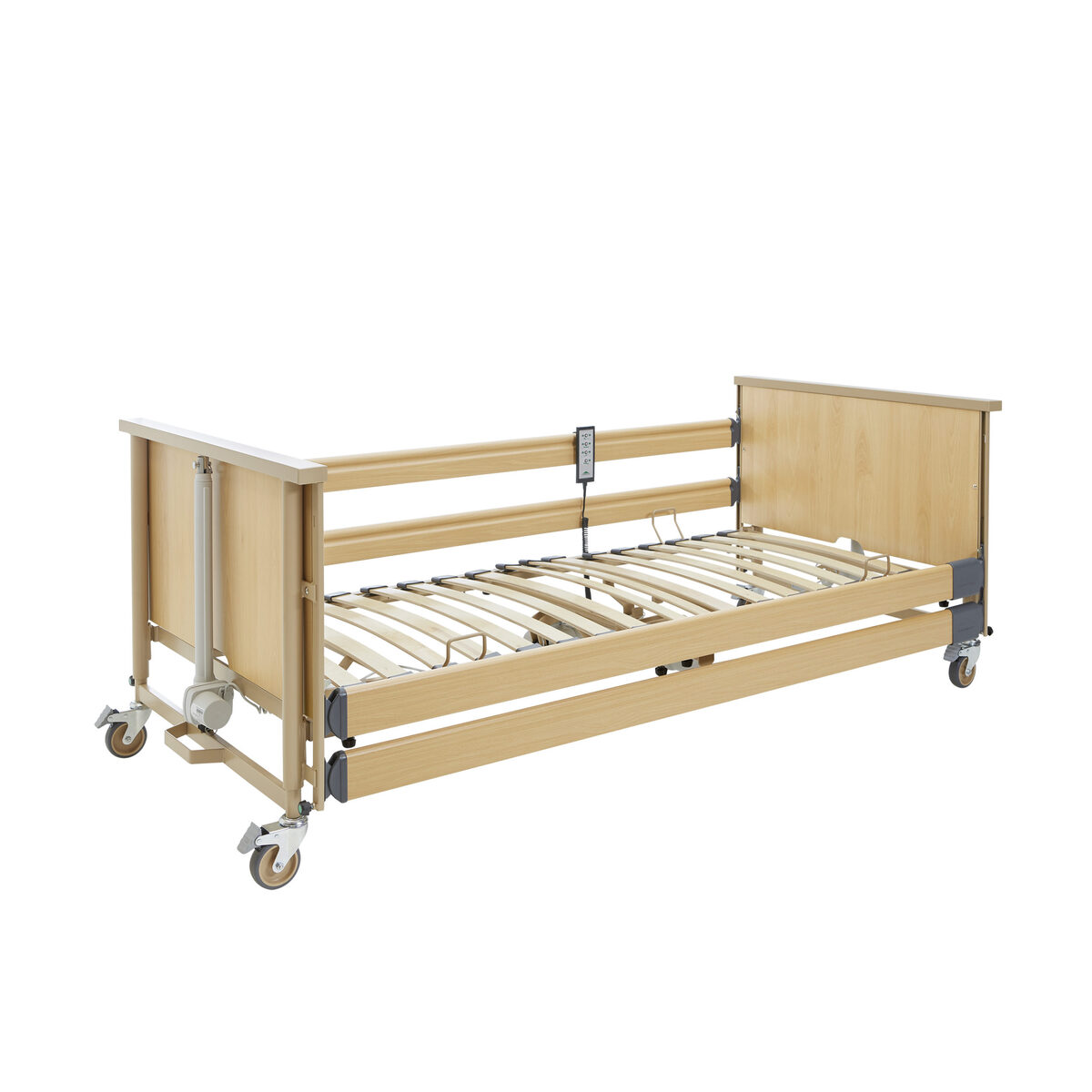 Discreta y elegante cama de madera, con somier de lamas de madera de 90 cm x 200 cm. 4 planos para mayor comodidad del residente, y barandillas de madera para la prevención de caídas. Altura regulable de 32 cm a 72 cm aproximadamente. El respaldo, las piernas y la altura de la cama se regulan electrónicamente por motores.