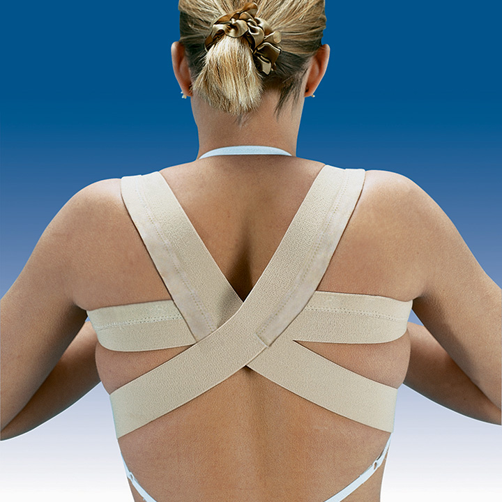 Espaldera correctora dorsal en ocho. Consta de dos bandas de tejido elástico algodonado terminadas en anillo independientes para cada lado de los hombros. Los extremos de las bandas ejercen una tracción gradual consiguiendo la retropulsión de los hombros y corrigiendo la mala postura cifótica.