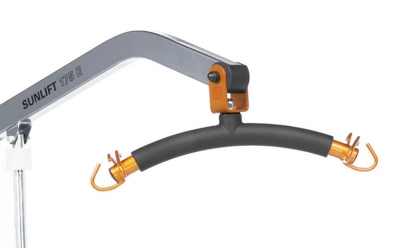 Perchas recubiertas de material antideslizante y con ganchos que se cruzan para impedir que la cinta del arnés pueda soltarse. Esta grúa dispone de un indicador de nivel de batería y de un aviso acústico contra descarga total al ser pulsado el control manual.