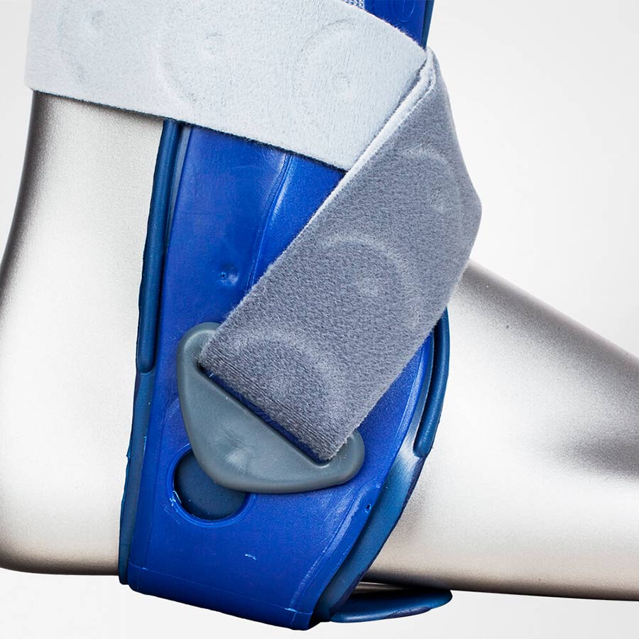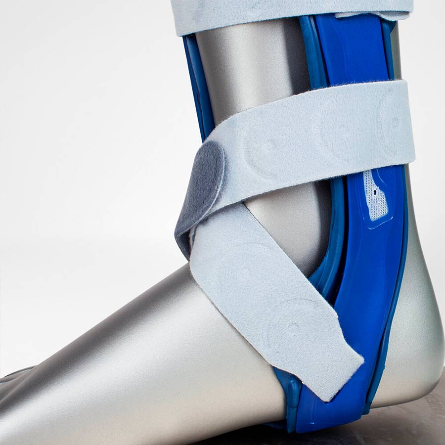 Óptima calidad del tratamiento agudo, sin refuerzo necesario. En caso necesario, es posible una adaptación individual. La forma anatómica con sujeción del borde exterior contrarresta la supinación incluso sin calzado y es funcional en comparación con los sistemas de aire. Un acolchado cómodo, sin fatiga, que proporciona un extraordinario confort. El efecto neuromuscular de las lengüetas plantares mejora la activación de las extensores del pie, contrarrestando la supinación. El sistema de cintas con velcro se debe colocar en forma de ocho garantiza una fácil y rápida colocación y un confort adicional.