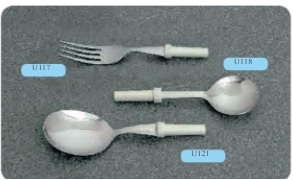 A este mango pesado se le pueden adaptar una serie de cubiertos especiales, como tenedor y cuchara estándar o cuchara sopera. (Si se necesitara de otro cubierto contactar con nosotros). Estos utensilios estándar están montados en tubitos plásticos que se colocan a presión en el mango elegido permitiendo variar el ángulo de la hoja según se desee.