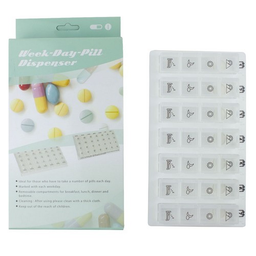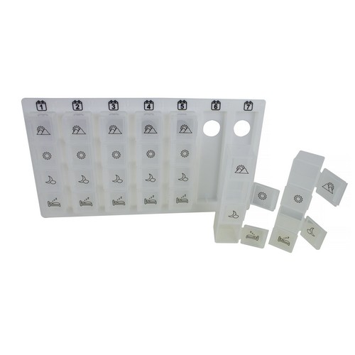Este práctico pastillero semanal de 4 tomas diarias contiene siete recipientes, uno para cada día de la semana. Es ideal para personas que tienen que tomar varias pastillas al día y para llevar el control. ¡No volverás a olvidar una toma con este pastillero!