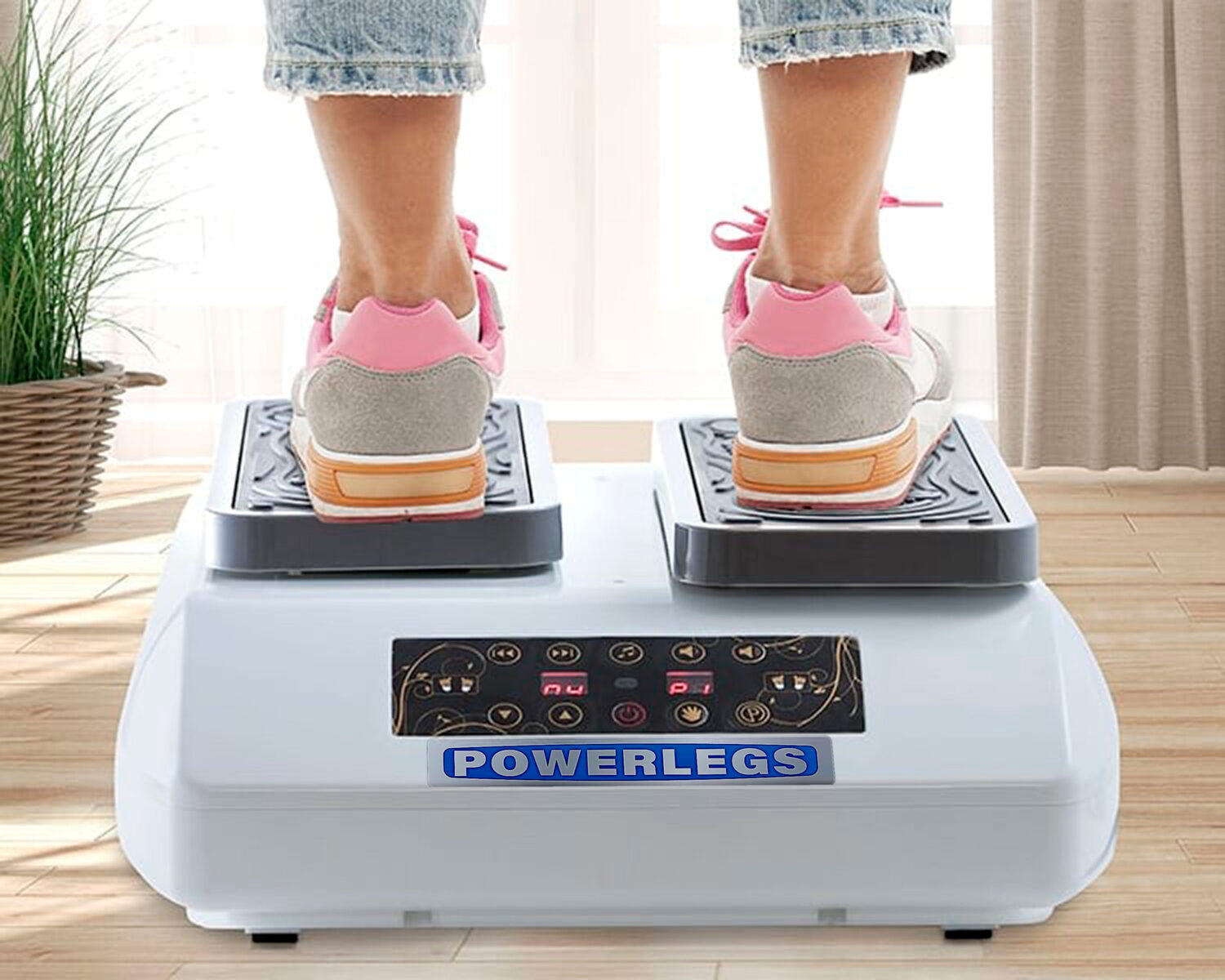 Dispositivo de entrenamiento POWERLEGS. Su uso es increíblemente sencillo. Solamente debes enchufarlo a la corriente, colocar los pies en las plataformas y seleccionar la velocidad. ¡Así de fácil!