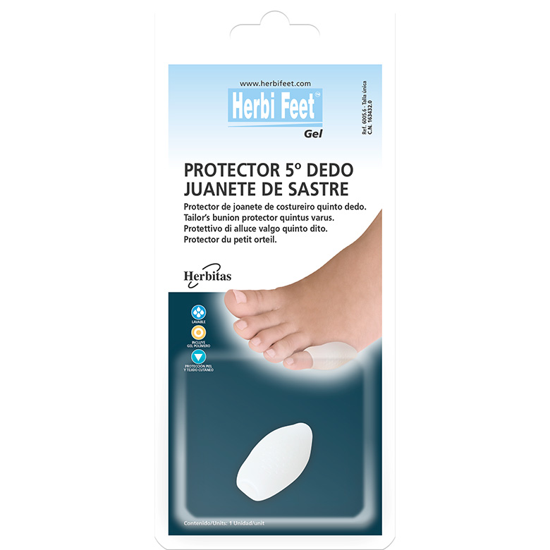 Protector de Juanete 5º dedo | Juanete de Sastre. Gracias a su especial densidad y a los aceites minerales de grado médico que contiene, suaviza y protege la piel. Reduce el dolor en la protuberancia ósea, disminuyendo la presión y evitando la fricción, en el juanete de sastre. Diseño anatómico. Talla única