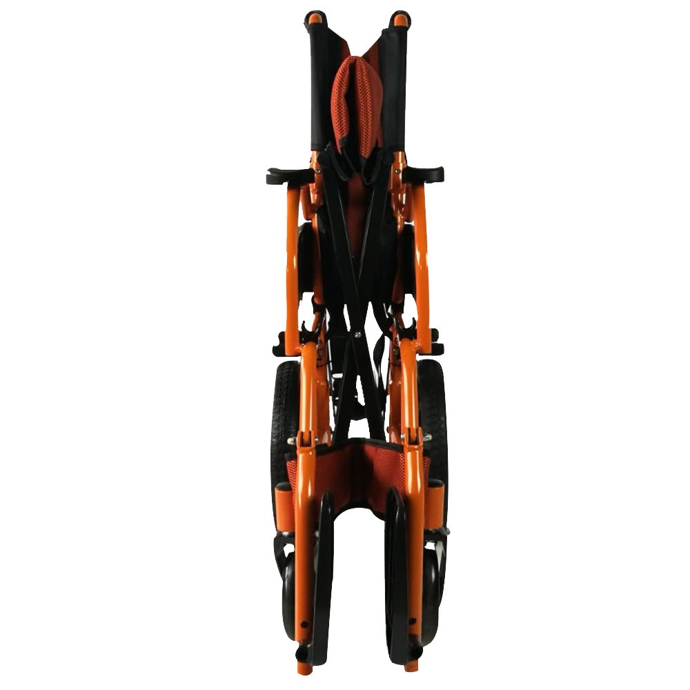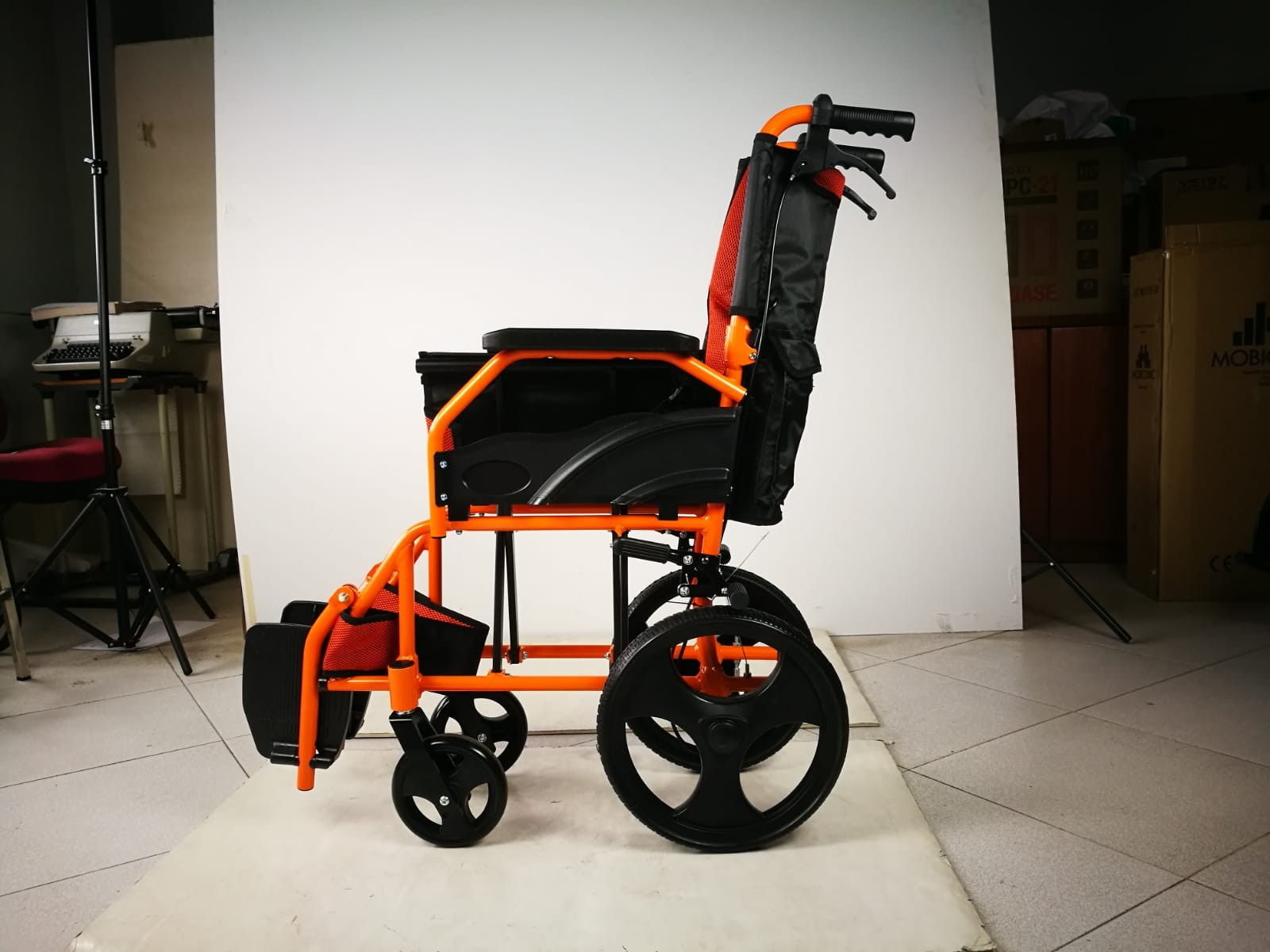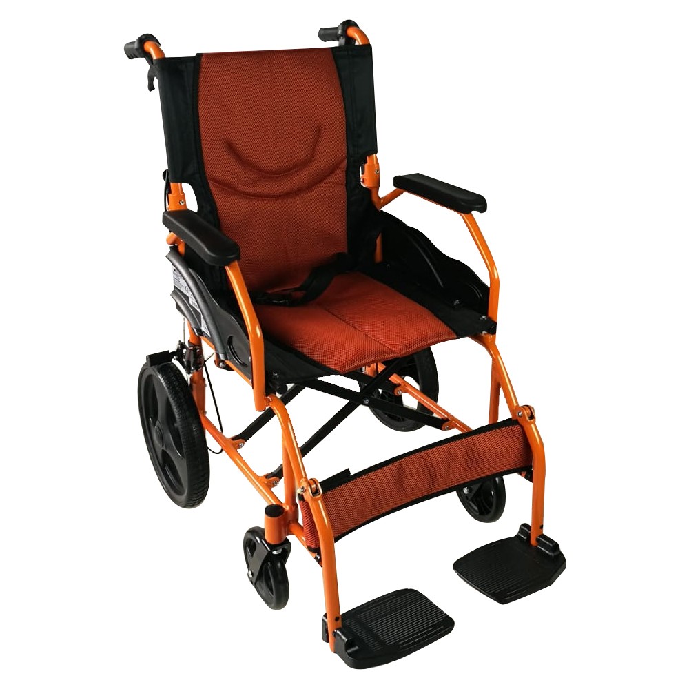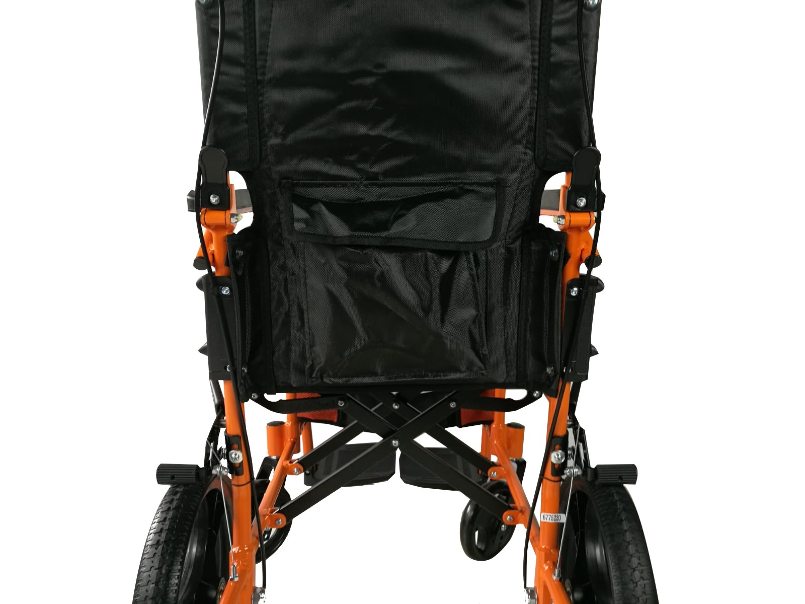 - Con respaldo fijo de color naranja y negro, reposabrazos fijos rectos largos y reposapiés abatibles hacia arriba, además de un respaldo abatible, que le harán más fácil la vida al usuario.