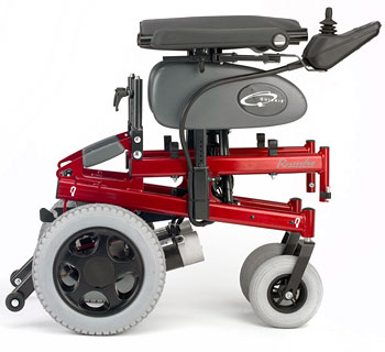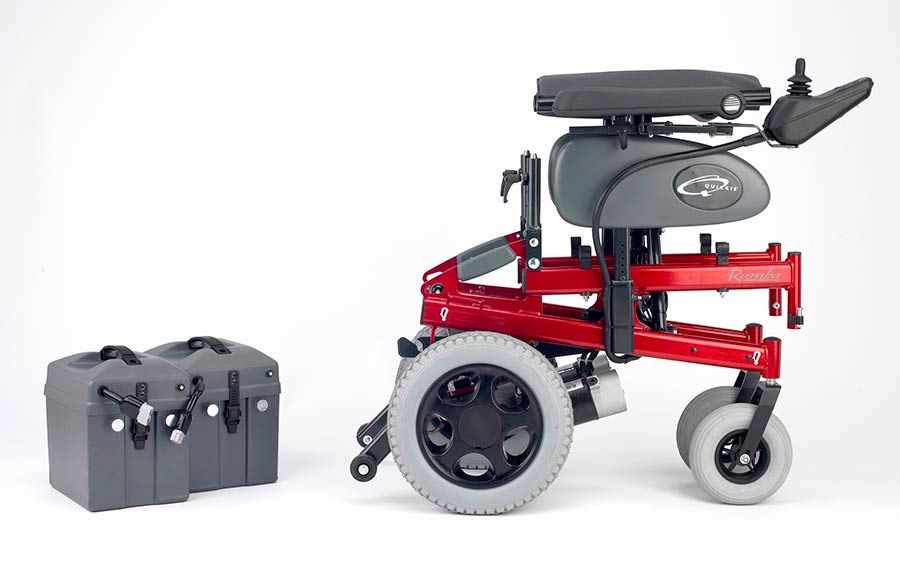El respaldo es fácilmente desmontable. Las baterías (de 50 Amp de serie) están alojadas en dos cajas, para que resulten más cómodas de manejar, y la estructura se pliega para ocupar el mínimo espacio, y poder así transportarla fácilmente. Además los antivuelcos se pliegan cuando hacen tope contra un obstáculo, por lo que la longitud de la silla se ve reducida en 5 cm. Esto es especialmente útil para tener cabida en ascensores.