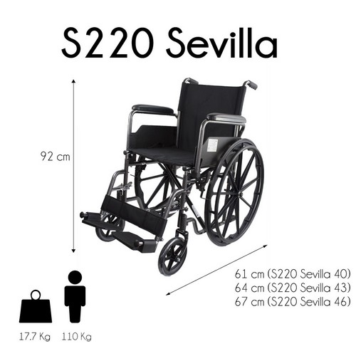 – Ancho total: 21cm + ancho del asiento. – Asiento de 40cm: 61 cm. – Asiento de 43 cm: 64 cm. – Asiento de 46 cm: 67 cm. – Peso: 12 kg (sin reposapies ni reposabrazos). – Profundidad de asiento: 40 cm.- Altura respaldo: 46 cm. – Altura asiento- suelo: 50 cm.- Altura total: 92 cm.- Dimensiones de la silla plegada: ancho de 30 cm; profundidad de 62 cm; altura de 92 cm.- Diámetro rueda: 60 cm.- Peso máximo soportado: 110 kg.- Ruedas macizas para silla de ruedas.