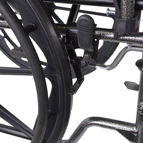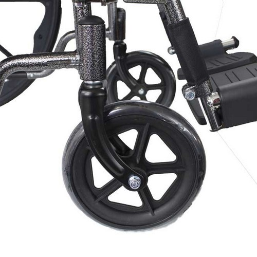 -Las ruedas son grandes y de goma maciza, se quitan tan solo apretando un botón. -Los reposapies también se extraen fácilmente para disminuir el peso y las dimensiones, y así transportarla mejor. También son regulables en altura para adaptar a la estatura del usuario. -Los brazos son abatibles para facilitar al cuidador la transferencia del usuario a la silla de ruedas, con reposabrazos de escritorio para facilitar la lectura, escritura o cualquier otra actividad que requiera el trabajo sobre una superficie.