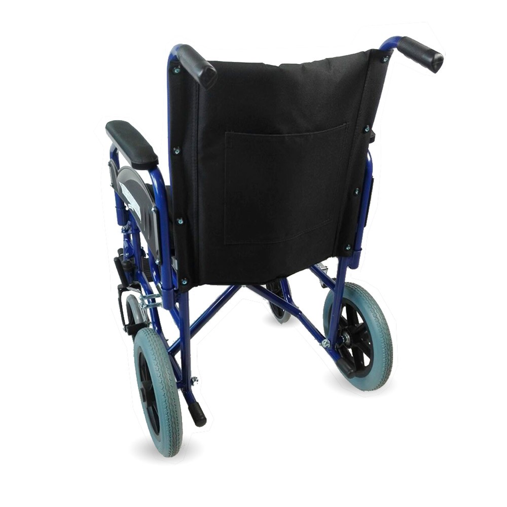- Esta silla de ruedas para ancianos está fabricada en acero de alta resistencia, presentando así una gran estabilidad, con respaldo fijo de color negro y azul, reposabrazos extraíbles rectos largos y reposapiés extraíbles, que le harán más fácil la vida al usuario.