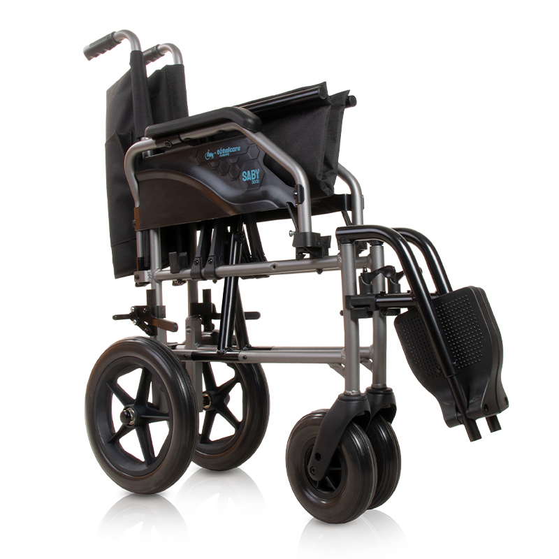 La silla de ruedas Saby está fabricada en aluminio y dispone de un sistema de doble cruceta para facilitar su plegado. Es muy ligera pero a la vez resistente, admitiendo un peso máximo de 120 kg.