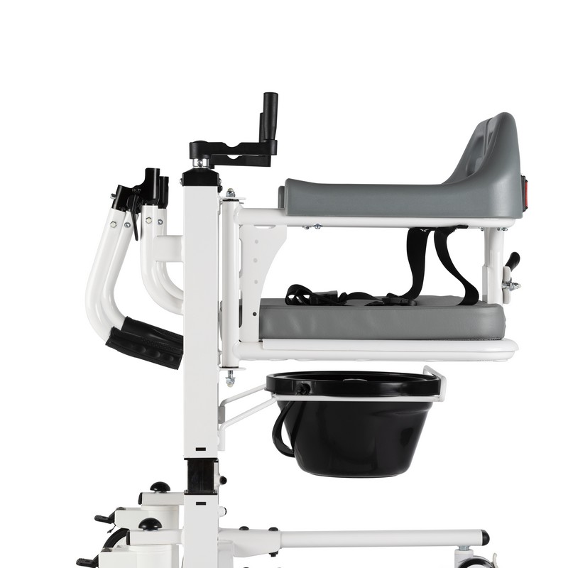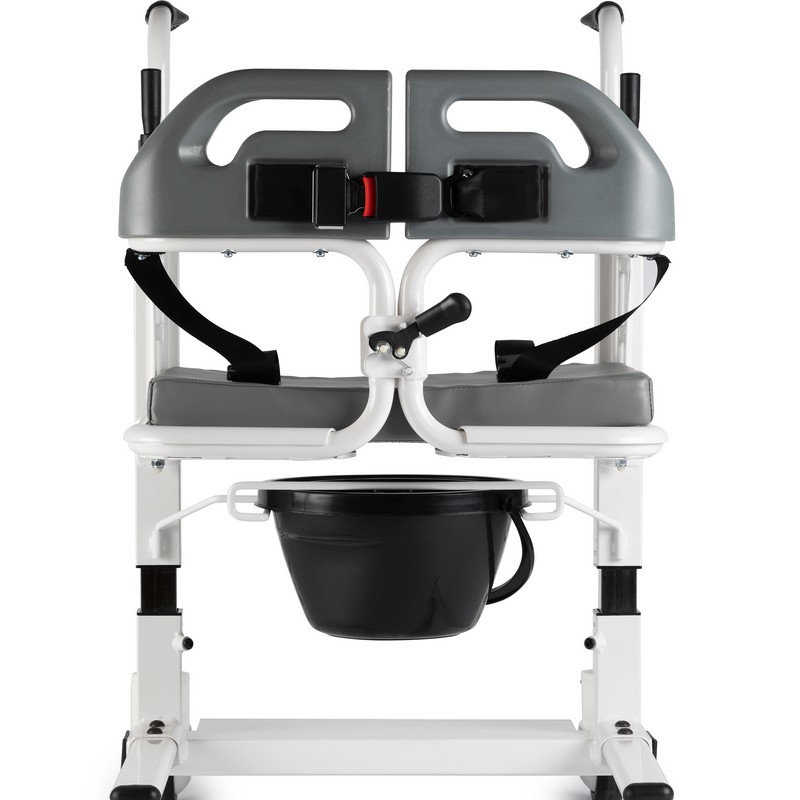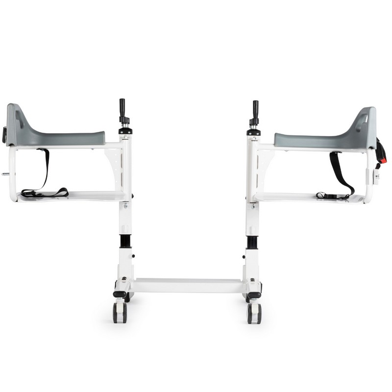Su novedoso diseño de amplia apertura de 180º facilita la transferencia y colocación del paciente en la silla, abriendo/cerrando ambas secciones del asiento.