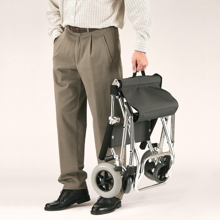Esta silla está fabricada con una aleación especial de aluminio y es extraordinariamente ligera solo 8,9 kg. Es de gran utilidad para el transporte de personas con movilidad reducida. De diseño súper compacto, se pliega en pocos segundos y queda reducida a un tamaño fácil de guardar. Muy confortable gracias a su asiento acolchado y a sus reposabrazos abatibles.