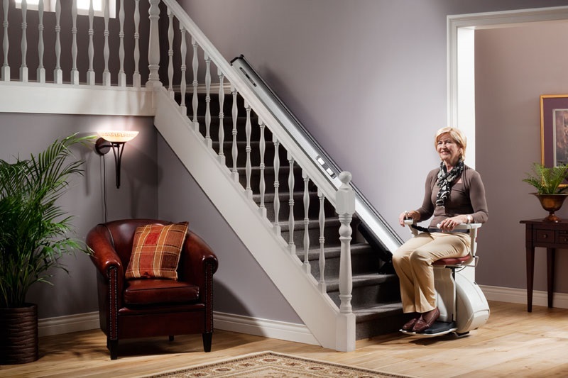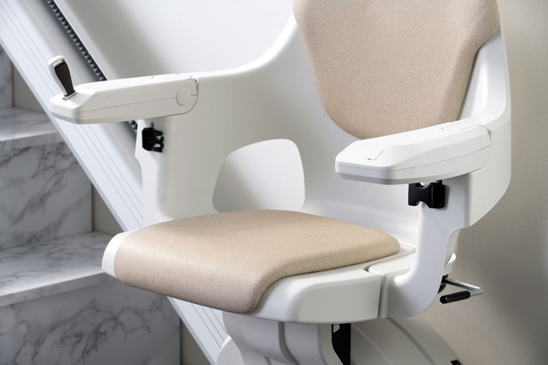 Reposabrazos y cinturón de seguridad; paro automático en caso de obstáculo en la escalera o raíl; limitador de velocidad; arranque y paradas suaves; avisador acústico.
