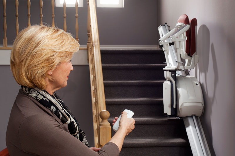 Mando de usuario en silla por joystick; 2 mandos a distancia con soporte para pared; raíl plegable automático para puertas o paso existentes al lado de la escalera (opcional).
