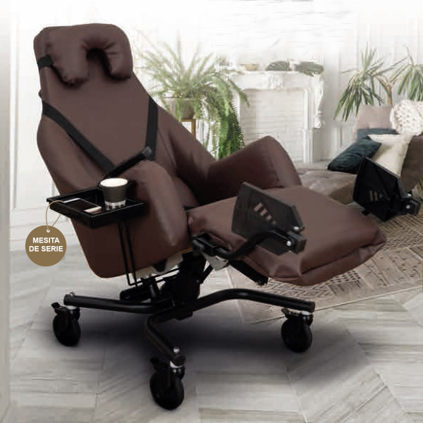 El sillón en forma de concha está fabricado en espuma HD (alta densidad). Está equipado de serie con: mesa auxiliar, asiento de espuma Visco (Clase II) con memoria de forma, arnés, almohada cervical anatómica.