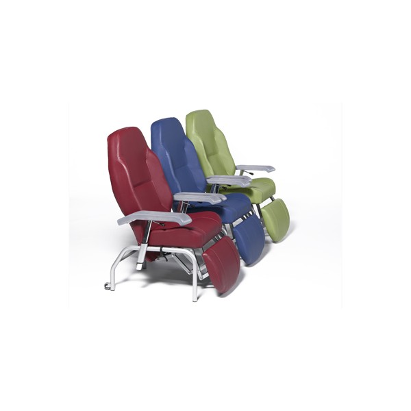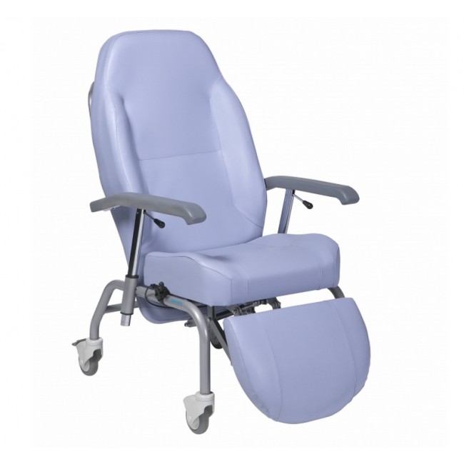 Sillón de descanso con 4 ruedas Normandie con respaldo reclinable y reposapies elevable de forma conjunta. Proporciona estabilidad y comodidad para al usuario debido al respaldo envolvente y espuma de alta densidad. Fabricado en piel sintética (o tela, a elegir), incluye de serie: