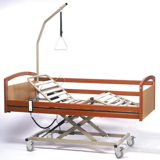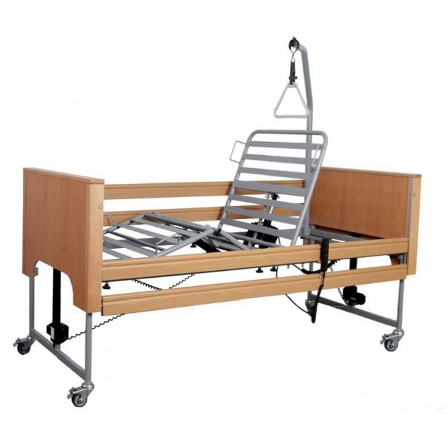 Cama electrónica articulada elevable Luna regulable en altura con carro elevador y kit de transporte (Incluye barandillas, cabecero y piecero de madera)